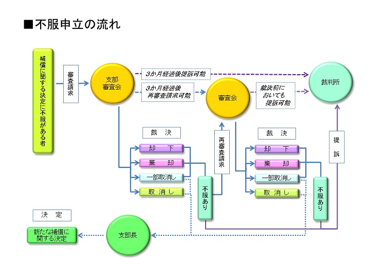 基金(支部長)が行う補償に関する決定について不服がある者は、行政不服審査法の適用を受け基金の支部審査会に対して審査請求をすることができます。審査請求は、支部長の補償に関する決定があったことを知った日の翌日から起算して3か月以内にしなければなりません。