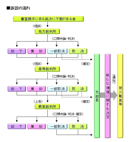支部審査会の裁決に対して不服のある者又は審査会の裁決を経てもなお不服がある者は、行政事件訴訟法の定めるところにより、支部審査会又は審査会の裁決があったことを知った日の翌日から起算して6か月を経過するまでに、地方公務員災害補償基金を被告として、基金本部又は支部の所在地を管轄する地方裁判所に「処分の取消しの訴え」を提起することができます。